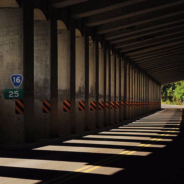 光線透過上頭塗有 25K 里程石柱之間空隙斜斜映入的影子痕跡