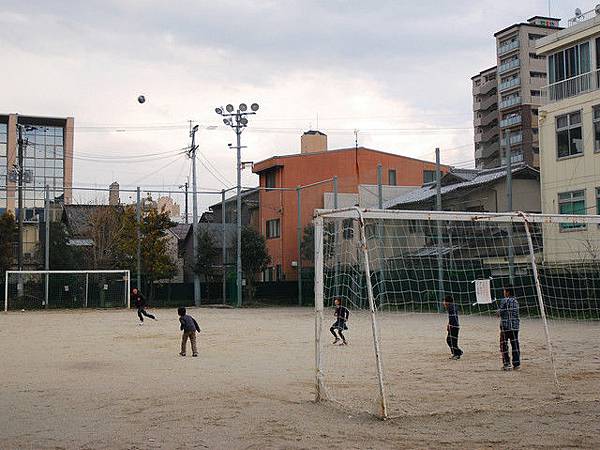 少有人車通過的街道一旁只有幾個小朋友踢著足球的小型公園